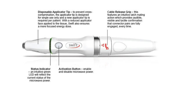 The Swift® device is designed with a highly contained treatment zone. The microwaves travel in straight lines with no lateral spread, as seen in other procedures such as Cryotherapy. The treatment device also features a disposable tip, which eliminates the risk of cross-contamination and the need for sterilization.